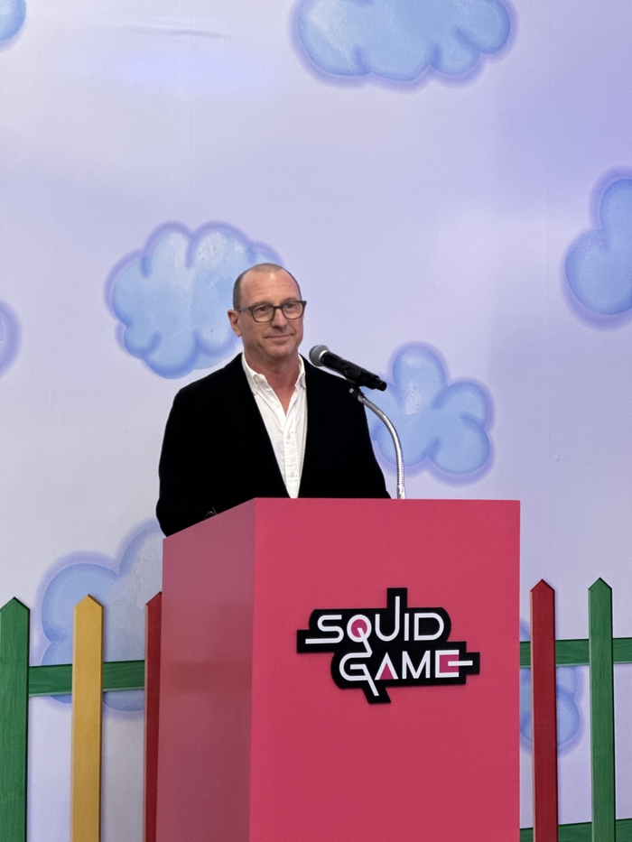 설명하고 있는 그렉 롬바르도(Greg Lombardo) 넷플릭스 익스피리언스 부문 총괄 / 사진=권효정 여행+ 기자 이날 행사에는 그렉 롬바르도(Greg Lombardo) 넷플릭스 익스피리언스 부문 총괄(VP)이 참석했다. 롬바르도 총괄은 “체험형 콘텐츠인 익스피리언스는 스토리텔링의 연장이 아니라 팬들이 사랑하는 캐릭터와 세계관 속으로 직접 뛰어들 수 있는 몰입형 경험을 제공한다”며 “지금까지 40개 어트랙션을 개발했고 전 세계 100개 도시에서 800만 명 이상의 관객이 다녀갔다”라고 밝혔다.