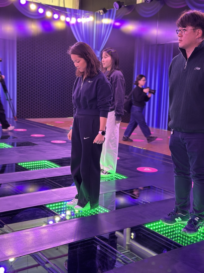 징검다리 건너기 게임 / 사진=권효정 여행+ 기자 방문객은 드라마 속 게임뿐 아니라 먹거리,인증샷 명소,공식 상품까지 한곳에서 즐길 수 있다. 이 체험관은 2023년 12월 LA에서 첫선을 보인 ‘스퀴드 게임: 더 트라이얼’에 이어 지난해 뉴욕,마드리드,시드니 등 세계 각지에서 큰 인기를 끌었다. 서울에서는 오는 28일 문을 연다.
