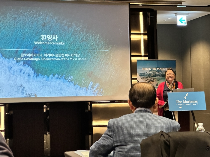 환영사 중인 마리아나관광청 이사회 글로리아 카바나 의장 / 사진=권효정 여행+ 기자 마리아나관광청은 스포츠 관광을 키우기 위해 유명 인사들을 홍보대사로 뽑았다. 배우 유이는 마라톤 홍보대사로 나서 오는 8일 사이판 마라톤에 직접 뛸 예정이다.
