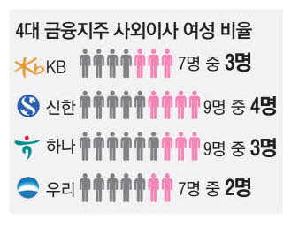 하나금융도 9명 중 2명뿐이었던 여성 비율을 이번에 끌어올렸다. 서영숙 전 SC제일은행 전무가 새로 사외이사진에 합류했다. 우리금융은 내부통제 강화를 이유로 사외이사 7명 가운데 4명을 물갈이하면서도 여성은 늘리지 않았다. 4대 금융지주 가운데 사외이사 여성 비율이 가장 낮다.