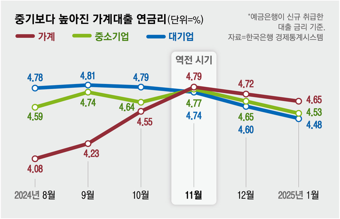 일반적으로 예금은행이 가계에 적용하는 대출금리는 중소기업 대출 이율보다 낮게 나타난다. 중소기업은 경기 변동과 업황에 따라 사업 실패 위험이 크지만,가계대출은 소득이 꾸준한 직장인이 주로 이용하기 때문이다. 실제 2022년 10월 이래 지난해 10월까지 가계대출 금리는 중소기업대출 이율보다 낮았다. 그러다 지난해 11월 2년1개월 만에 중소기업대출 금리를 역전했다. 작년 11월의 경우 가계대출 금리는 연 기준 4.79%로 대기업대출(4.74%)과 중소기업대출(4.77%)을 모두 넘어섰다. 이후 1월까지 가계대출 금리는 0.12%포인트 떨어졌지만 같은 기간 대기업대출 금리는 0.26%포인트,중소기업대출은 0.24%포인트 떨어지면서 하락 폭이 두 배에 달했다.