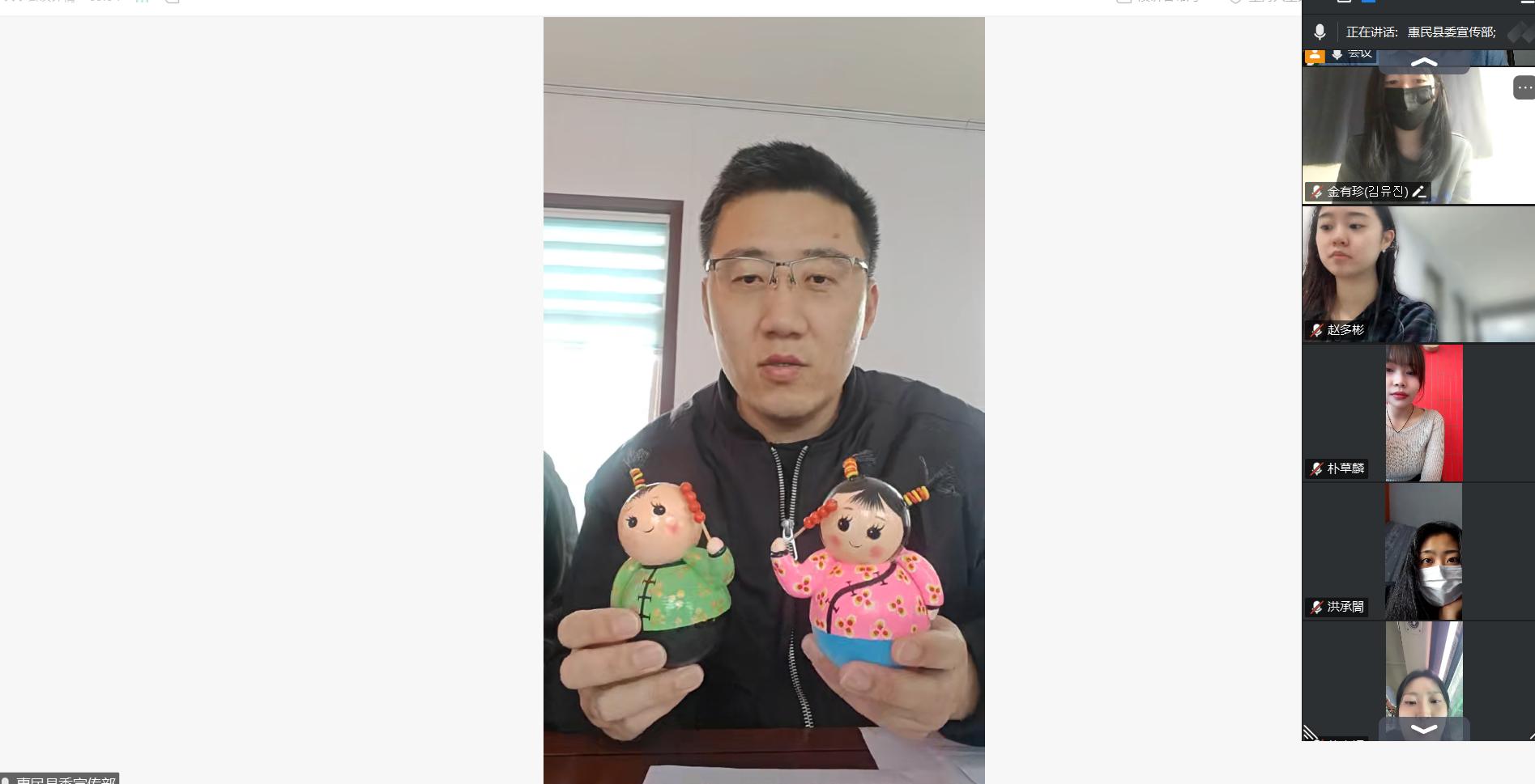 3월 7일, 빈저우시 惠民현과 한국 우호학교가 온라인 문화 교류회를 개최하였다. 惠民현 皂户李진(자오후리진)은 국가급 무형문화유산인 惠民 진흙 인형을 매개로 한국항공대학교 학생들에게 중국 전통문화의 매력을 선보였다. 이번 행사에는 惠民현 皂户李진 경제발전사무소 부주임 겸 홍보통일전선사무소 주임인 무수타오(牟树涛)와 문화관 관장 바이야오펑(白耀鹏)이 참석하였다.