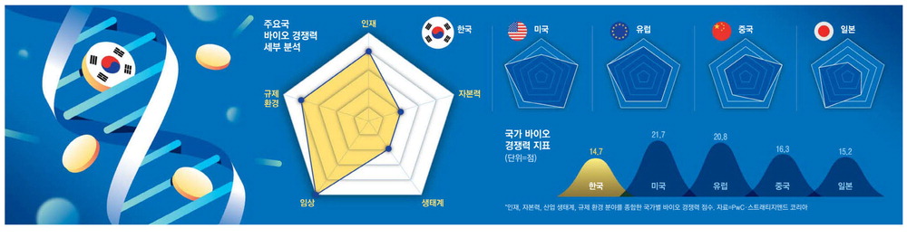 18일 매일경제 비전코리아 프로젝트팀이 글로벌 컨설팅사 PwC·스트래티지앤드와 함께 주요국 '바이오 경쟁력 지표'를 산출한 결과 한국 평점은 14.7점으로 미국(21.7점)은 물론 중국(16.3점),일본(15.2점)에도 밀렸다. 생명과학 논문 피인용 수,인구 100만명당 연구 인력을 비롯한 인적 자원과 임상 현황,규제 현황,산업 생태계,자본 조달 능력 등 5개 잣대를 추려 종합 평점을 매긴 결과다.