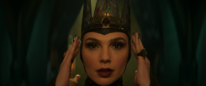 디즈니 뮤지컬 영화 ‘백설공주’에서 사악한 여왕(갤 가돗)이 거울을 들여다 보고 있다. <월트디즈니 컴퍼니 코리아> 매혹적이지만 사악한 여왕은 영화 ‘원더우먼’에서 정의롭고 강인한 히어로를 연기한 갤 가돗이 맡았다. 악역을 처음 연기한 그는 뮤지컬 특유의 동작과 연극적인 표현으로 단순한 질투심을 넘어 권력에 집착하는 인물을 표현했다.