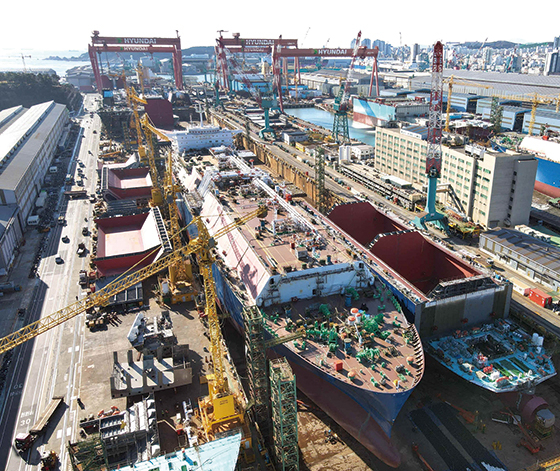 HD현대중공업 독에서 건조 중인 LNG 선박. 미국 무역당국의 대(對)중국 견제 효과가 한국 조선산업에 본격적으로 나타나기 시작했다. 중국 조선소를 선호해왔던 글로벌 해운사들이 한국 조선소의 문을 두드리고 있기 때문이다. 최근 조선 협력이 한미 양국간 주요 관심사로 부상하면서 국내 조선사들은 필리핀,인도 등에서 생산능력 확대를 검토하고 있다.