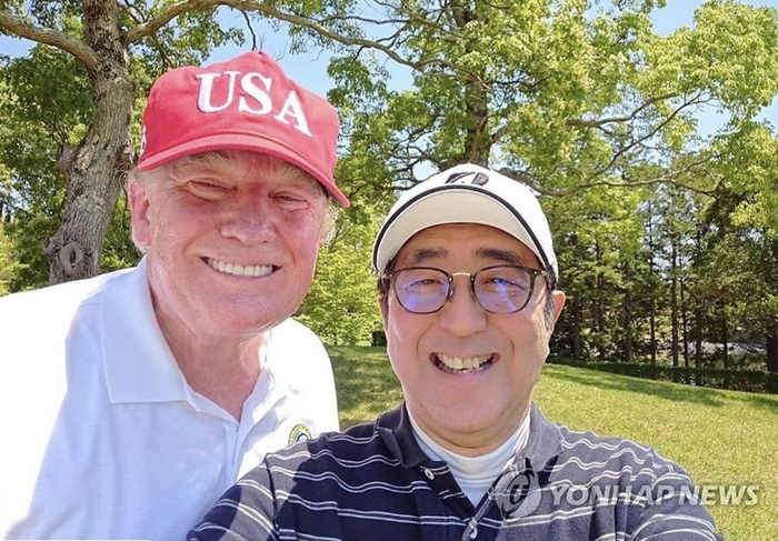 도널드 트럼프 집권 1기 당시 그가 아베 신조 일본 총리와 골프 라운딩을 한 후 기념촬영을 한 모습.[연합뉴스]