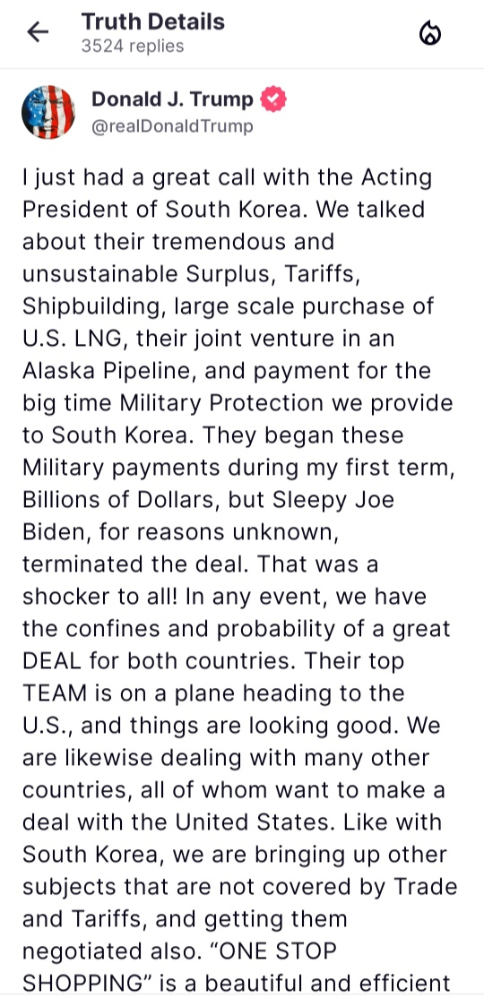 트럼프 대통령은 통화 직후 사회관계망서비스(SNS) ‘트루스소셜’에 “한국의 대통령 권한대행과 훌륭한 전화 통화를 했다(I just had a great call with the Acting President of South Korea)”라고 적었다. 이 통화는 12·3 비상계엄,트럼프 집권 2기 첫 한미 정상 간 통화로 의미가 컸는데 SNS 글에는 ‘한덕수’ 또는 ‘친구’ 등의 표현은 없었다.