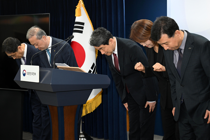 지난 17일 서울 종로구 정부서울청사에서 2026학년도 의대 모집인원 조정 방향 관련 브리핑에 앞서 이주호 사회부총리 겸 교육부장관(가운데)가 고개를 숙이고 있다. [이충우 기자] 교육부가 결국 2026학년도 의대 모집인원을 올해 5058명에서 지난해 수준인 3058명으로 줄이는 안을 확정했다.