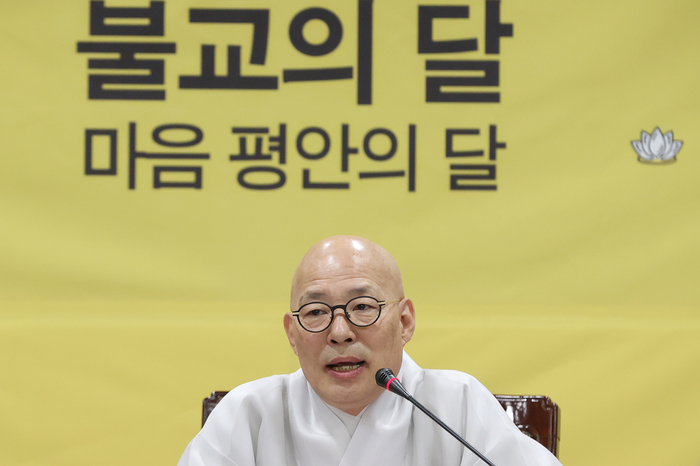 조계종 총무원장 진우스님이 22일 서울 종로구 한국불교역사문화기념관에서 부처님오신날 기자간담회를 하고 있다. <연합뉴스>