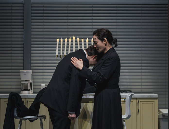 연극 ‘그의 어머니’에서 브렌다(김선영)가 첫째 아들 매튜(최호재)를 위로하고 있다. <국립극단>