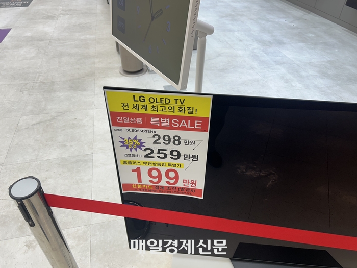 홈플러스 상동점 1층에선 LG OLED TV 전시상품 특별 세일이 진행 중이었다. [변덕호 기자] 가전제품의 경우 진열제품을 중심으로 대폭 할인했다.
