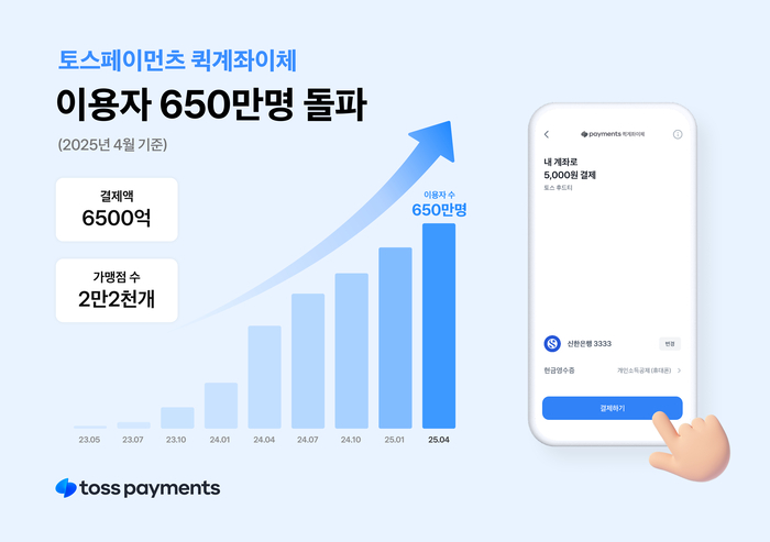 토스페이먼츠 ‘퀵계좌이체’,출시 2년 만에 누적 이용자 수 650만명 돌파 [사진 출처 = 토스] 비바리퍼블리카(토스)의 전자지급결제대행(PG) 계열사 토스페이먼츠는 2023년 4월 출시한 간편 계좌이체 서비스 ‘퀵계좌이체’의 누적 이용자 수가 2년 만에 650만명을 돌파했다고 24일 밝혔다.