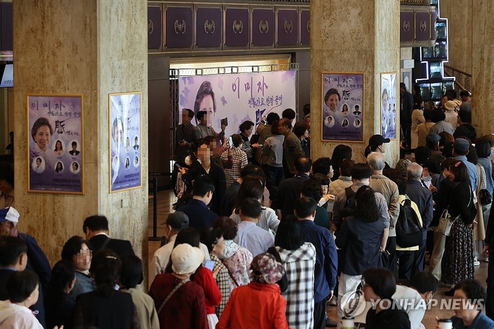 27일 서울 종로구 세종문화회관에서 열린 가수 이미자 마지막 콘서트 ‘전통 가요 헌정 공연-맥(脈)을 이음’에서 관객들이 포토월에서 기념사진을 찍기 위해 줄지어 서 있다. 연합뉴스 가수 이미자(84)가 서울 광화문 세종문화회관 대극장에서 열린 ‘전통 가요 헌정 공연-맥(脈)을 이음’을 마지막 공연으로 무대에서 은퇴한다.
