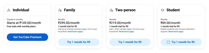 더버지에 따르면 인도에서 유튜브 프리미엄 개인 요금제는 149루피,2인 요금제는 219루피,가족요금제는 299루피다.