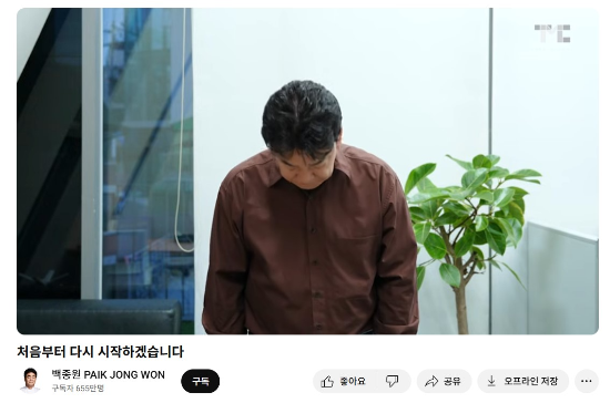 백종원 유튜브 갈무리. 백종원 더본코리아 대표가 “모든 방송 활동을 중단하겠다”며 다시 한번 고개를 숙였다.