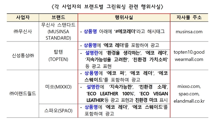 각 브랜드별 거짓 친환경 광고 행위. [공정거래위원회]
