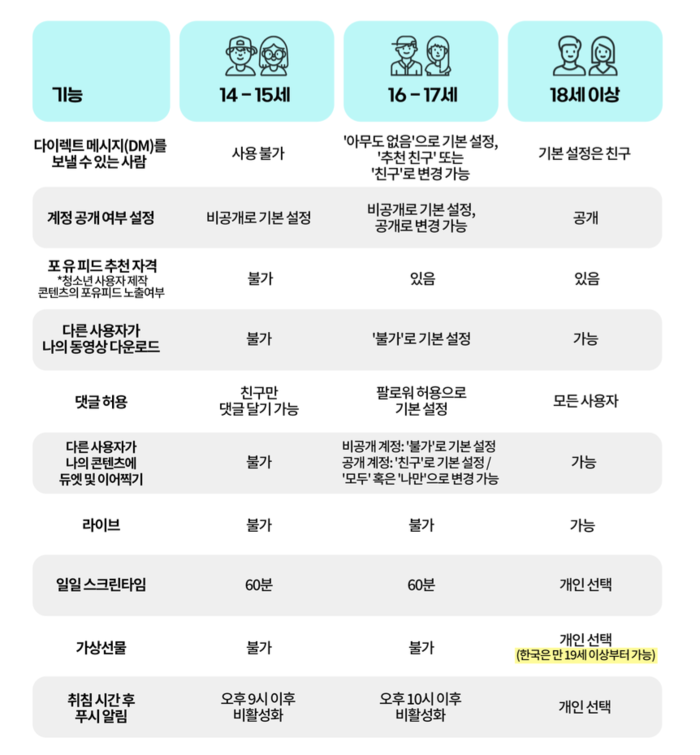 이곳 관계자는 틱톡이 청소년 안전을 위해 연령별로 엄격한 기준을 두고 있다는 점을 강조했다. 한국의 경우 국내법상의 청소년의 기준을 따라 만 14세 이상의 청소년들만 틱톡을 이용할 수 있다. 만 16세 미만 계정은 기본 설정이 비공개로 돼있으며,다이렉트 메시지(DM) 사용이 제한된다. 만 18세 미만은 라이브 스트리밍이 불가능하다.