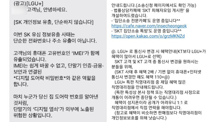 26일 온라인 커뮤니티에 따르면 전날 LG유플러스 대리점은 SK텔레콤에서 개인정보 유출 사고가 일어난 것은 심각한 문제라며 집단 소송을 대리해 주겠다는 내용의 마케팅 메시지를 보냈다.