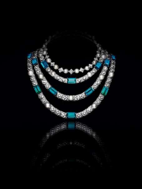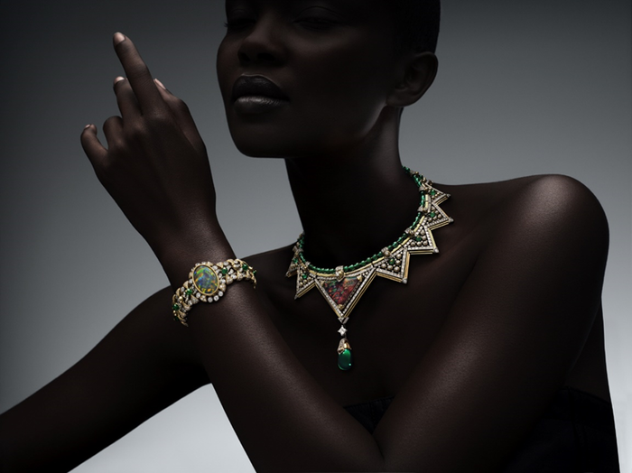 특히,신비롭고 매혹적인 네크리스는 레드와 그린 조합의 30.56 캐럿 삼각형 컷 블랙 오팔과 28.01 캐럿 에메랄드 드롭이 어우러졌다. 이 피스는 1500시간에 걸쳐 완성됐으며,루이 비통 트렁크의 각진 형태와 못에서 영감을 받은 세팅 다이아몬드가 특징이다.