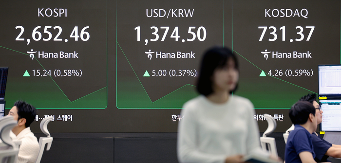 28일 서울 중구 하나은행 본점 딜링룸에 코스피,코스닥지수,원/달러 환율이 표시돼 있다.[사진=연합뉴스] 28일 서울외환시장에서 달러당 원화값은 전일 주간거래 대비 6원 내린 1375.5원에 출발해 오전 10시 5분 현재 1373.9원에 거래되고 있다. 원화값은 지난 26일부터 주간 종가기준 1360원대를 유지하다 달러 강세 흐름에 하락 전환했다.