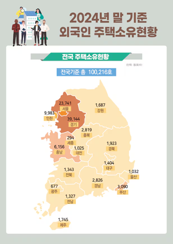사진=국토교통부 제공 지역별로는 수도권 집중 현상이 뚜렷하다. 외국인이 소유한 전체 주택 가운데 72.7%에 해당하는 7만2868가구가 서울·경기·인천 등 수도권에 집중됐다. 경기(3만9144가구)가 가장 많고,서울(2만3741가구),인천(9983가구) 순으로 집계됐다. 지방은 충남(6156가구),부산(3090가구),경남(2826가구),충북(2819가구),경북(1923가구) 등 순이었다.