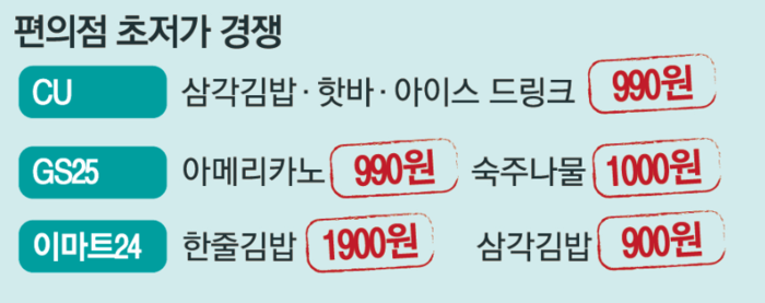 2일 업계에 따르면 BGF리테일이 운영하는 CU는 아메리카노 2종을 얼음컵을 무료로 증정하는 행사까지 적용해 990원에 판매하거나,3.3㎏ 대용량 봉지 얼음을 업계 최저가인 3990원에 선보이는 등 초저가 제품 출시에 ‘올인’하고 있다.지난 3월엔 100장당 1990원에 구매할 수 있는 물티슈 등을 출시한 데 이어 지난달엔 990원짜리 삼각김밥·핫바 등 제품군을 대폭 확대했다.GS25도 초가성비 제품을 전면에 배치했다. 지난 3월 자체 브랜드(PB) 초가성비 라인업을 크게 늘린 것이 대표적이다.