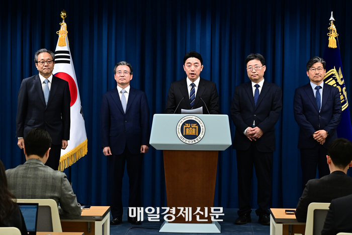 강훈식 대통령 비서실장이 6일 서울 용산 대통령실 청사에서 대통령실 수석비서관 인선을 발표하고 있다. (왼쪽부터) 문진영 사회수석,김용범 정책실장,강 비서실장,하준경 경제성장수석,류덕현 재정기획보좌관. 2025.06.06. [이승환 기자] 새 정부 첫 추가경정예산 편성을 앞두고 이재명 대통령이 지난주 임명한 김용범 정책실장,류덕현 재정기획보좌관 경제정책 참모 3인방의 재정운용 철학에 관심이 모아진다.