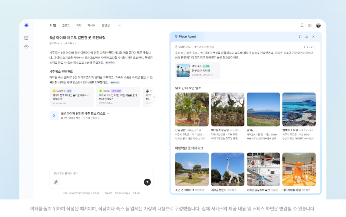 예를 들어 사용자가 AI 탭에 ‘5살 아이와 제주도 갈 만한 곳 알려 줘’ 라고 입력하면 플레이스 에이전트를 통해 장소 추천이 이뤄진다. 사용자가 마음에 드는 장소를 선택한 뒤 여행 코스를 요청하면 지도에서 최적의 동선을 안내한다. 교통편·숙소 예약·결제는 물론 여행에 필요한 물건을 구매할 수 있도록 도와준다.