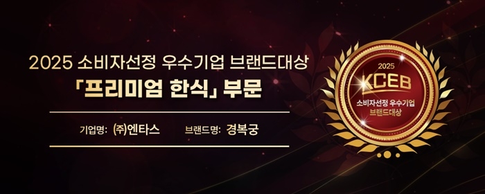 < 출처 : ㈜엔타스 > 프리미엄 한정식 브랜드 ‘경복궁’이 지난 6월 11일 ‘2025 소비자 선정 우수기업 브랜드대상’에서 프리미엄 한식 부문 대상을 수상하며,대한민국을 대표하는 한식 브랜드로서의 저녁을 다시 한번 입증했다.