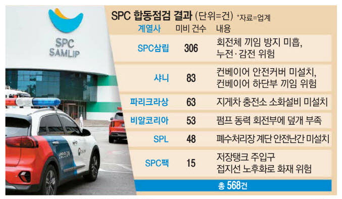 SPC삼립 시화공장 사망 사고에 대한 경찰 수사가 진행 중인 가운데 SPC가 그룹 내 모든 생산센터(공장)를 대상으로 자체 진행한 안전점검 결과,총 568건의 미흡 사항이 확인됐다. 문제의 시화공장에서도 끼임 방지 등 안전장치가 부실했던 것으로 나타났다. 총 568건 가운데 341건은 개선 조치가 완료됐으며,나머지 미흡 사항은 늦어도 다음달까지는 개선한다는 방침이다.