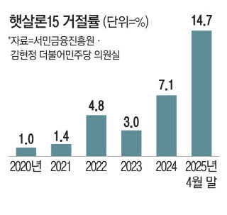19일 김현정 더불어민주당 의원실에 따르면 '햇살론15'를 신청했다 거절당한 사람 비율이 지난해 말 7.1%에서 올해 4월엔 14.7%까지 두 배 높아진 것으로 집계됐다. 햇살론15는 연 소득이 적으면서 신용등급도 낮은 사람이 신청하는 것으로,햇살론 관련 상품 중에서도 가장 사정이 어려운 계층을 대상으로 한다.