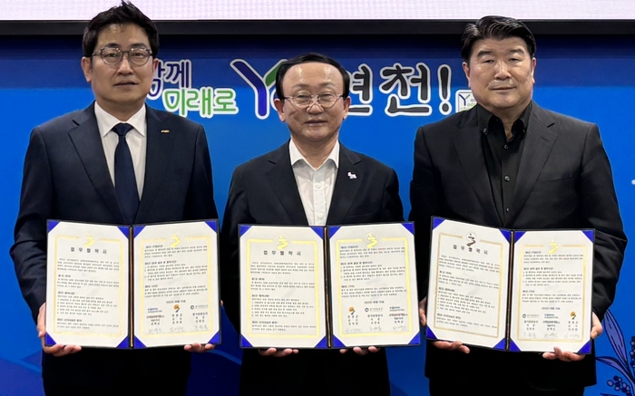 경기도 DMZ열차 공동상품 개발 업무협약식. 경기관광공사,코레일이 25일 DMZ열차 기반 관광상품을 공동 개발,운영하기로 하는 업무협약을 체결했다. 왼쪽부터 권백신 코레일관광개발 사장,김덕현 연천군수,조원용 경기관광공사 사장 순. <사진=경기관광공사 제공> 군사분계선 접경지역을 운행하고 있는 ‘DMZ열차’가 경기도 최북단의 연천군까지 확대된다.