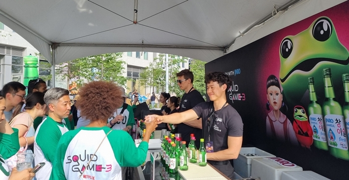 [사진제공=하이트진로] 하이트진로(대표 김인규)가 지난 20일(현지시간) 미국 뉴욕 도미노파크(Domino Park)에서 열린 ‘오징어 게임’ 시즌3 뉴욕팬 이벤트에 단독 브랜드 파트너로 참여해 진로(JINRO) 부스를 운영했다고 25일 밝혔다.