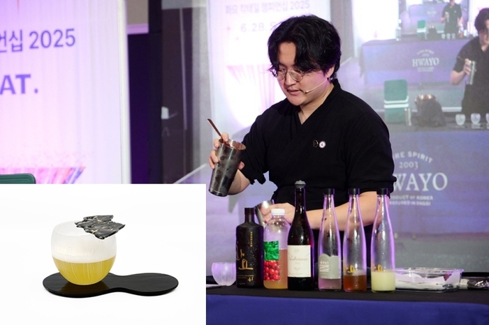 윤선호 바텐더와 ‘화공예’ [사진제공=화요] 프리미엄 증류주 브랜드 화요가 주최한 ‘2025 화요 칵테일 챔피언십(HWAYO Cocktail Championship 2025)’에서 윤선호 바텐더의 ‘화공예’가 대상을 받았다.