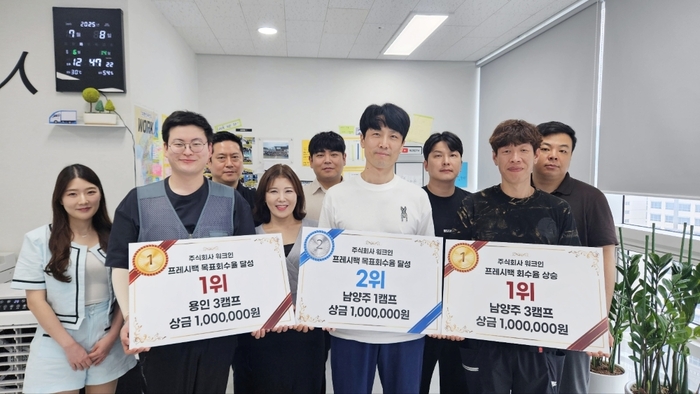 < 출처 : 워크인 > 용인3캠프 인대성 팀장은 “상금은 전액 동료들과의 회식 비용으로 사용할 예정”이라며 팀워크 강화를 약속했고,남양주1캠프 김명석 팀장은 “동료들에게 주유 상품권을 지급할 예정”이라 전했다. 남양주3캠프 박진영 팀장은 “사용처는 아직 미정이지만 동료들과 충분히 의논 후 결정하겠다”라고 소감을 말했다.