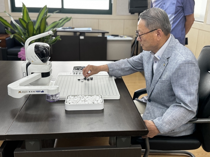 한 어르신이 NHN이 충북 진천군에 기증한 AI 돌봄로봇 ‘바둑이’와 대국하는 모습 [사진 = NHN] NHN이 노인과 함께 바둑을 두는 인공지능(AI) 로봇으로 노인 복지에 나선다.