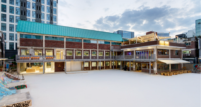 크래프톤이 11일 정식 개장하는 서울 성동구 성수동 ‘펍지 성수’의 전경. 스케이트보드를 탈 수 있는 마당과 두 개의 건물로 구성돼 있다. [사진 = 크래프톤] 펍지 성수는 2개 동에 8개 구역으로 구성됐다. 대지 면적만 1985㎡(약 600평)에 달한다. 구체적으로 체험을 위한 A동과 휴식을 위한 B동으로 구분된다. ▲플레이그라운드 ▲서바이벌홀 ▲루트스토어 ▲부트캠프 ▲플레이아레나 ▲카페 ▲라운지 ▲루프탑 ▲오픈스페이스 등으로 공간을 가득 채웠다.
