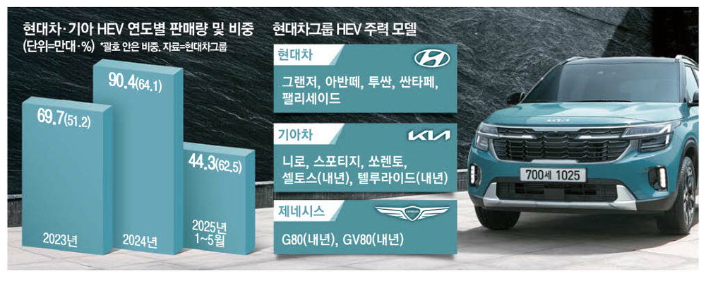 현대차와 기아의 친환경 차량 판매는 계속해서 증가하고 있는 추세인데,그 중심에는 하이브리드 차량이 있다. 2022년 전기차의 약진에 따라 하이브리드 비율이 50% 밑으로 떨어지기도 했으나,작년에는 캐즘으로 인해 다시 64.1%로 절대 다수를 차지하기에 이르렀다.