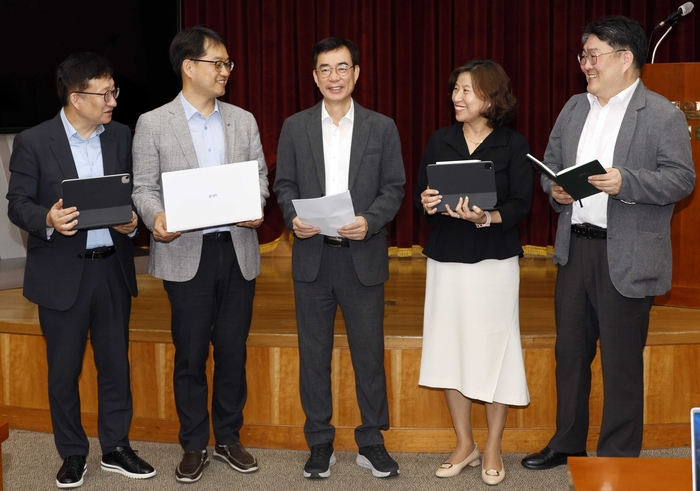 최근 매일경제 본사에서 열린 사이버 보안 좌담회에 참석한 전문가들이 토론에 앞서 기념촬영을 하고 있다. 왼쪽부터 이원태 국민대 특임교수(전 KISA 원장),김창오 정보통신기획평가원(IITP) 정보보안 PM,조영철 한국정보보호산업협회(KISIA) 회장,김정녀 한국전자통신연구원(ETRI) 사이버보안연구본부장,김동조 한컴위드 최고기술책임자(CTO). 김호영 기자