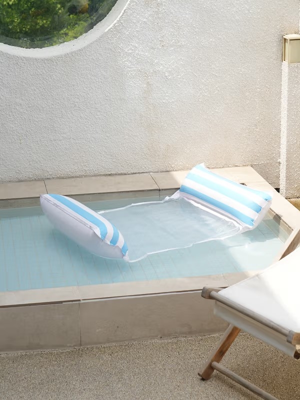 ‘해먹 그물 튜브’를 통해서는 여유로운 휴양지 감성을 느낄 수 있다. 양쪽을 받쳐주는 원형 튜브와 중간의 그물 시트로 구성돼 있어,수면 위에 편하게 누워 휴식을 취하기에 적당하다. 함께 사용하면 무드를 더해주는 ‘아이스버킷 맥주잔 튜브’도 있다. 얼음과 함께 음료나 과일 등을 시원하게 담아둘 수 있고,수건이나 소지품을 보관하는 용도로도 활용 가능하다.