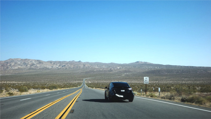 에이드로 AOX로 디자인 된 리어범퍼를 장착한 모델Y가 미국 캘리포니아 고속도로 바스토우-론파인 구간에서 도로 검증을 실시하고 있다. [사진 제공=에이드로]