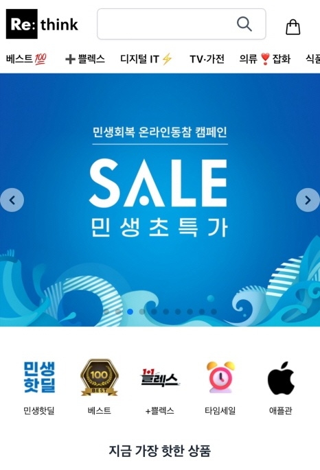 < 출처 : 리씽크(Re:think) > 더 경제적인 쇼핑 플랫폼 리씽크(Re:think)는 최근 정부의 민생 소비 쿠폰이 오프라인 중심으로 운영되며 온라인 소비자들의 소외감이 커지고 있는 가운데,‘민생 할인 초특가 기획전’을 전격 개최하며 민생 회복 캠페인에 민간 차원에서 동참한다고 밝혔다.
