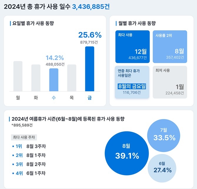 가장 많은 연차를 사용한 달은 12월이었다. 12월에는 전체 휴가 등록 건수의 12.7%인 43만6677건의 휴가가 등록됐다. 두 번째로 사용이 많았던 달은 35만7402건의 휴가가 등록돼 전체의 10.4%를 차지한 8월로 연말 휴가와 여름휴가 기간에 연차 사용량이 집중된 것으로 보인다.