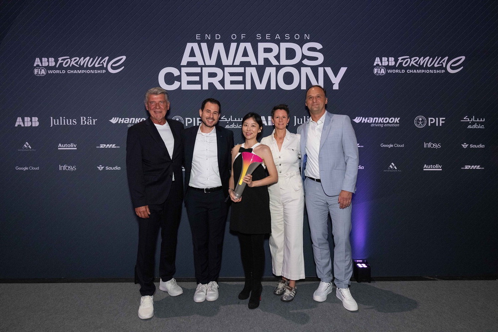한국타이어는 5일 전기차 레이싱 대회 'ABB FIA 포뮬러 E 월드 챔피언십' 시즌 11에서 '베스트 팬 익스피리언스 오브 더 이어' 상을 수상했다고 밝혔다. 만프레드 산드비흘러 한국타이어 모터스포츠 디렉터(맨 왼쪽)와 엘리 놀먼 포뮬러 E 마케팅 총괄(왼쪽 넷째) 등이 기념촬영을 하고 있다. 한국타이어