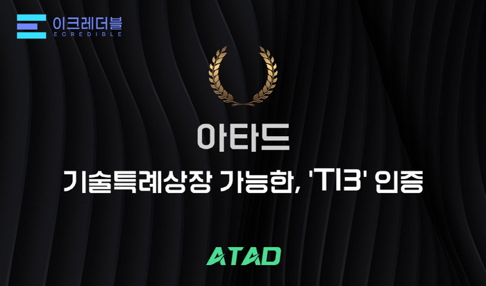 < 사진 제공 = ATAD Corp > 아타드(ATAD)가 AI 멀티 클라우드 자율 운용 플랫폼 ‘오딘(Odiin)’으로 이크레더블에서 진행한 기술신용평가(TCB,Technology Credit Bureau)에서 ‘TI3’ 등급을 인증받았다고 밝혔다.