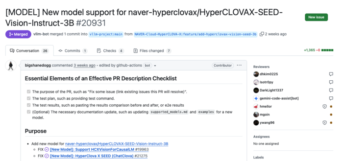 14일 정보기술(IT) 업계에 따르면 30억개의 파라미터로 구성된 네이버의 ‘하이퍼클로바 X 시드 3B’ 모델은 지난달 25일 글로벌 AI 플랫폼 ‘깃허브’에서 운용되는 오픈소스 AI 서빙 시스템인 ‘vLLM(버추얼 LLM) 프로젝트’에서 공식 지원 목록에 등재됐다. 국내 멀티모달 모델이 이 명단에 포함된 건 이번이 처음이다.