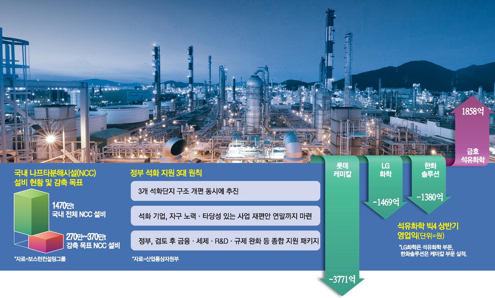 정부가 발표한 석유화학산업 구조 개편 방향은 '당근'보다는 '채찍'에 무게가 실렸다. 각 사는 연말까지 정부에 사업 재편 계획을 제출해야 하고,석유화학업계는 국내 생산설비 중 최대 4분의 1에 해당하는 규모를 구조조정해야 한다. 그동안 각 사의 이해관계에 따라 버티기 전략을 펼쳐왔던 석유화학업계에 정부가 사실상 '최후통첩'을 한 것으로 평가된다.