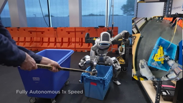 20일 보스턴다이내믹스가 공개한 영상에서 아틀라스가 연구원들의 방해에도 스스로 판단해 업무를 수행하는 모습 [사진=보스턴다이내믹스 유튜브 캡쳐] 아틀라스가 박스에서 또다른 박스로 부품을 옮기는 작업을 수행하는 중 한 연구원이 부품 박스 뚜껑을 닫거나 박스 옆에 부품을 떨어뜨리는 등 작업을 방해하지만,아틀라스는 당황하지 않고 뚜껑을 열거나 떨어진 부품을 주워 정확히 박스에 담는 모습을 보여준다.