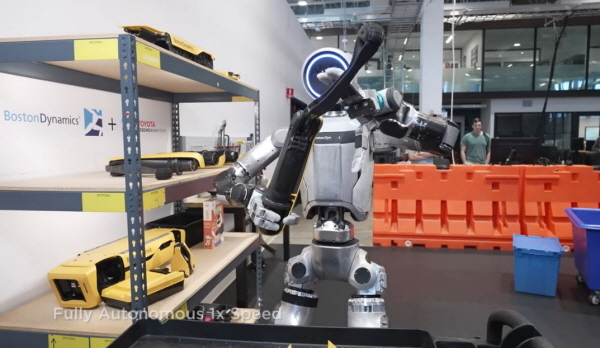앞서 아틀라스가 엔진커버 부품을 이동식 보관함으로 옮기는 작업을 수행하는 모습을 선보였던 보스턴다이내믹스는 이번에 도요타리서치연구소(TRI)와 공동 개발한 거대행동모델(LBM)을 적용해 한층 더 사람 같아진 아틀라스의 작업 모습을 공개했다.