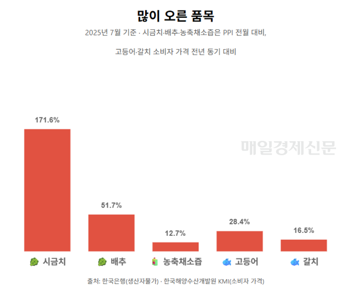 세부 품목 중에서는 시금치(171.6%),배추(51.7%),쇠고기(6.5%),돼지고기(4.2%),기타 어류(11.3%),넙치(9.3%) 등이 큰 폭으로 상승했다.